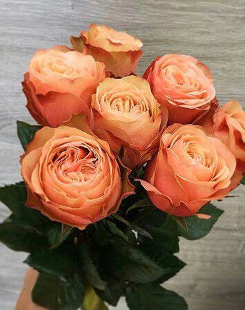 Роза кустовая - 2 шт., Роза Аваланж пич (50см) РОССИЯ - 3 шт., Эвкалипт большой - 1 шт., Современная упаковка - 1 шт., Лента атласная - 1 шт.Доставка 0₽ от 30-ти минут