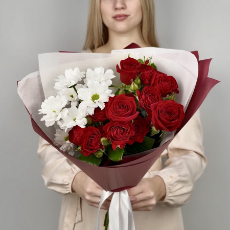 Романтичный и нежный букет порадует каждого и будет долго радовать получателя, ведь в составе стойкие хризантемы, альстрмерии и герберы.